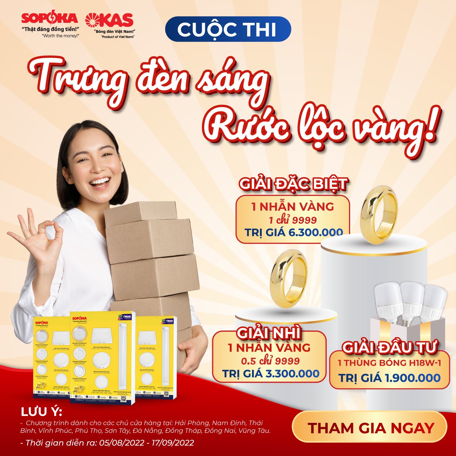 Để tri ân và hỗ trợ quảng bá sản phẩm thiết bị điện SOPOKA và thiết bị chiếu sáng OKAS cùng các chủ cửa hàng, đại lý, Công ty TNHH Chế tạo Thiết bị điện OMEGA phát động cuộc thi “TRƯNG ĐÈN SÁNG, RƯỚC LỘC VÀNG” lần 1 tại các khu vực: Hải Phòng, Nam Định, Thái Bình, Vĩnh Phúc, Phú Thọ, Sơn Tây, Đà Nẵng, Đồng Tháp, Đồng Nai, Vũng Tàu.