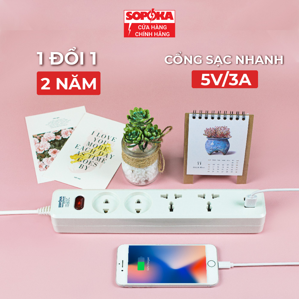 - 2 cổng sạc USB có trên ổ cắm điện đa năng SOPOKA 4U2 sử dụng chipset thông minh, đảm bảo tính năng tự cân bằng điện vô cùng an toàn. Tổng công suất 20W.