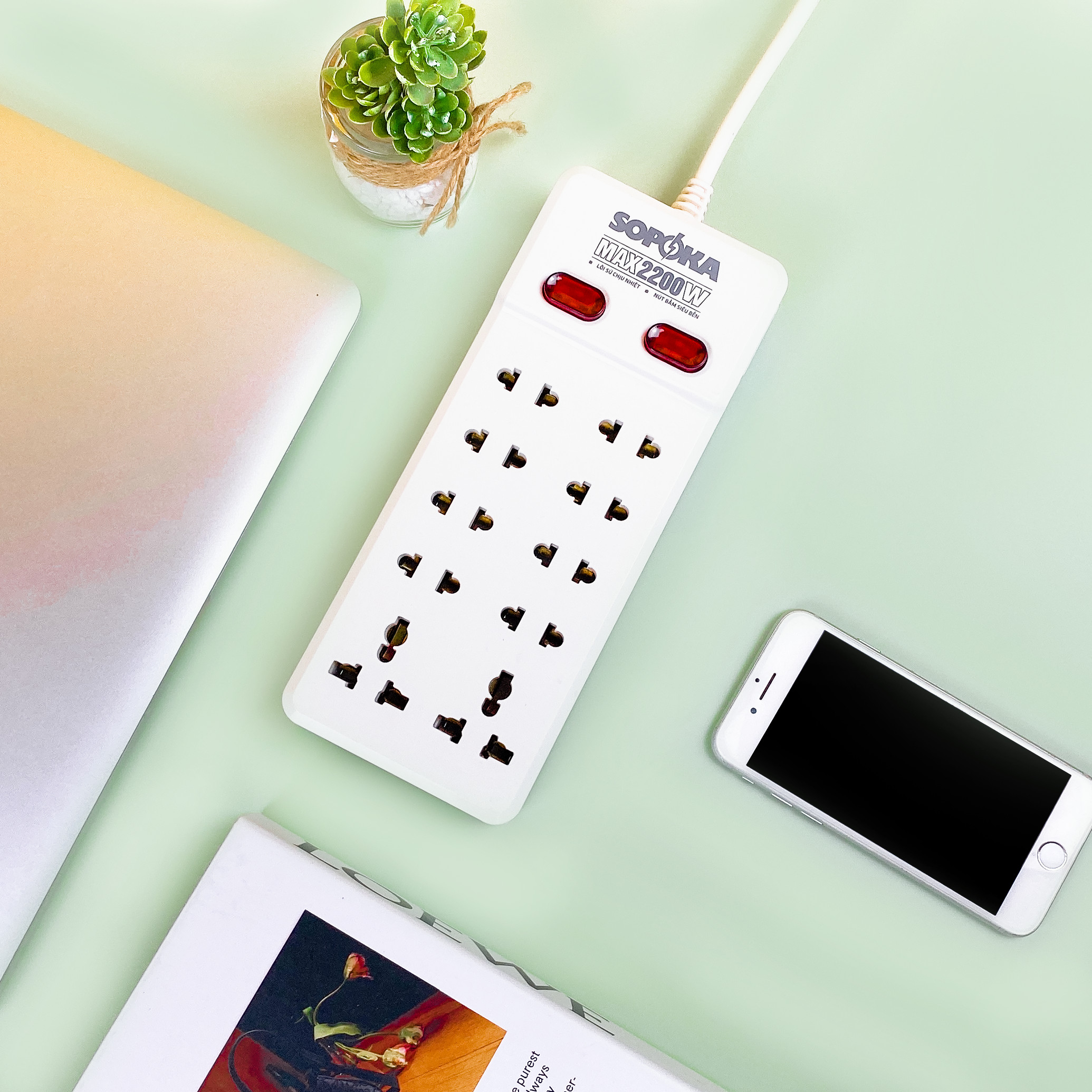 Ổ cắm nối dài – 10Y Sopoka sẽ là lựa chọn hoàn hảo dành cho các văn phòng, phòng khách, kệ TV, bàn máy tính, những nơi cần kết nối nhiều thiết bị. Tổng công suất 2200W và 10 cổng cắm, trong đó có 8 cổng cho phích 2 chấu và 2 cổng đa năng dành cho phích 3 chấu, phù hợp với tất cả các thiết bị điện.